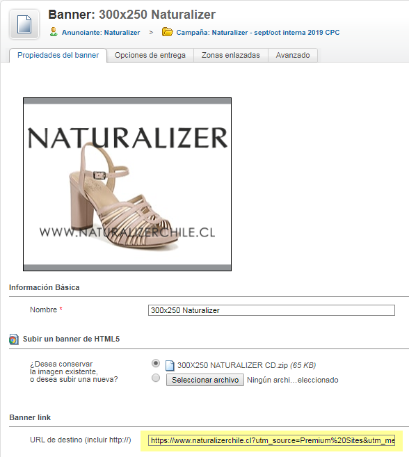 • Luego, el anuncio en HTML5 zip debe indicarse la url de landing page con tracking indicada por el cliente. Como ejemplo de implementación de estos cambios puede revisarse campaña de Naturalizer, cuyos zip se adjuntan al pie de esta nota.