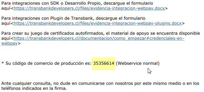 El cliente, al firmar el anexo de contrato con transbank para iniciar su recaudación en línea con Webpay Plus recibe de transbank un correo donde es informado de su habilitación. El correo es estandarizado, y en algún párrafo indica los siguiente: