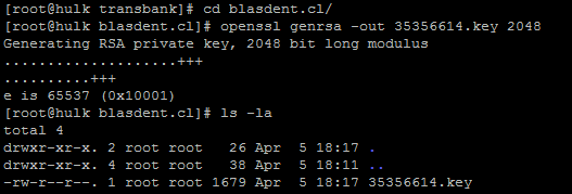 Una vez dentro del directorio creado para la empresa cliente, ejecutar el siguiente comando, reemplazando el número del archivo .key con el código comercio que haya entregado transbank.:
