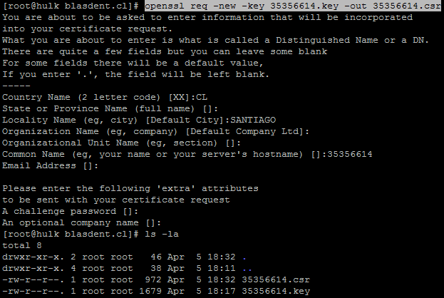 El comando solicitará algunos parámetros, los que deben ser indicados como sigue (la mayoría van en blanco, por lo que solo debe presionar enter en dichos casos):