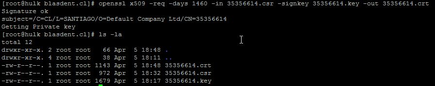 openssl x509 -req -days 1460 -in 597035356614.csr -signkey 597035356614.key -out 597035356614.crt