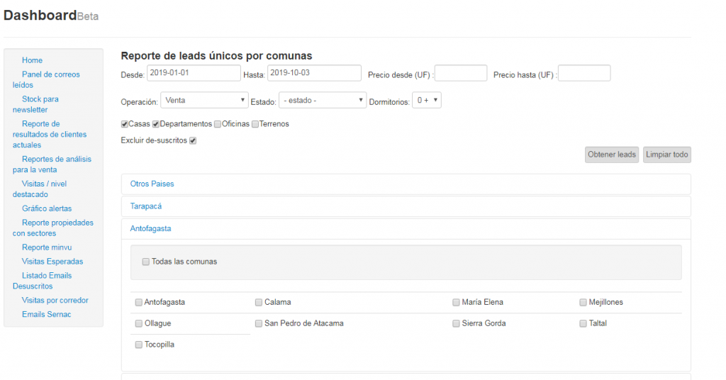 Para que la base no sea tan pequeña, considerar en principio, año en curso, si faltan ir más atras y obtener más leads. Incluir tanto departamentos como casas, a no ser que se indique algo específico distinto. Es posible segmentar por comunas.