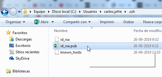 Debe abrir el archivo id_rsa.pub en un editor de texto y luego copiar la información en el campo clave: