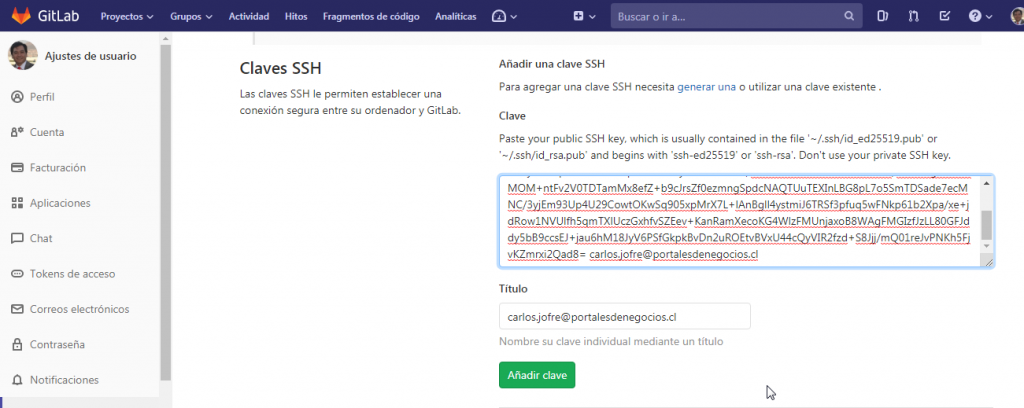 Incorporación de la clave generada a Gitlab