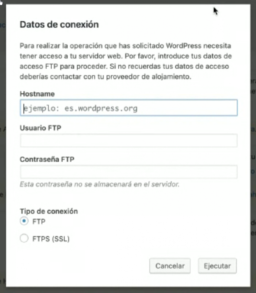 En algunos casos suele desplegarse la siguiente solicitud (o similar) ante el intento de actualizar wordpress o instalar/desinstalar componentes o plugins
