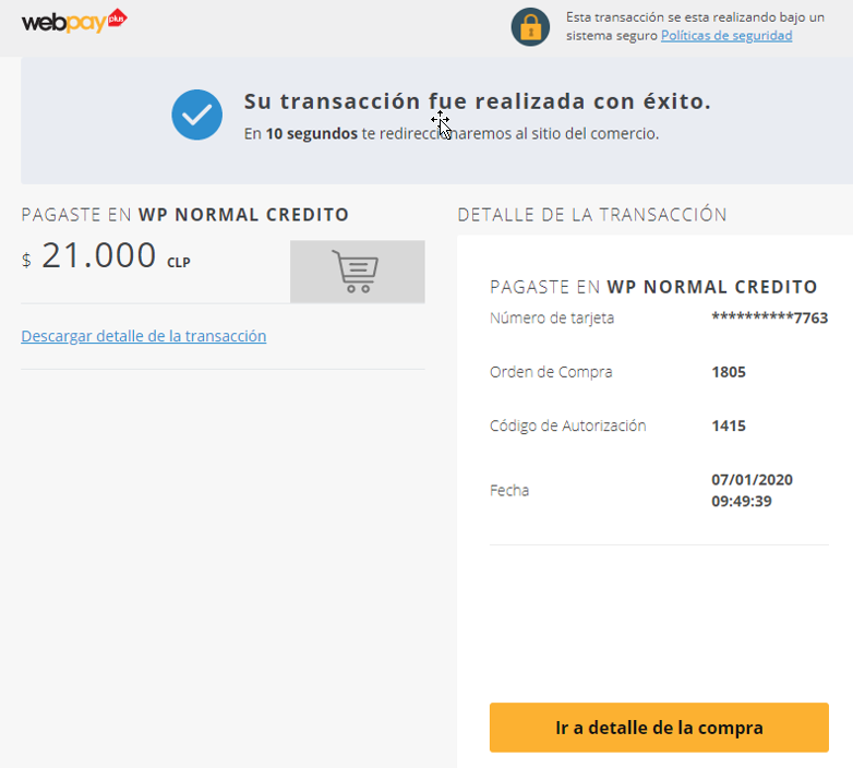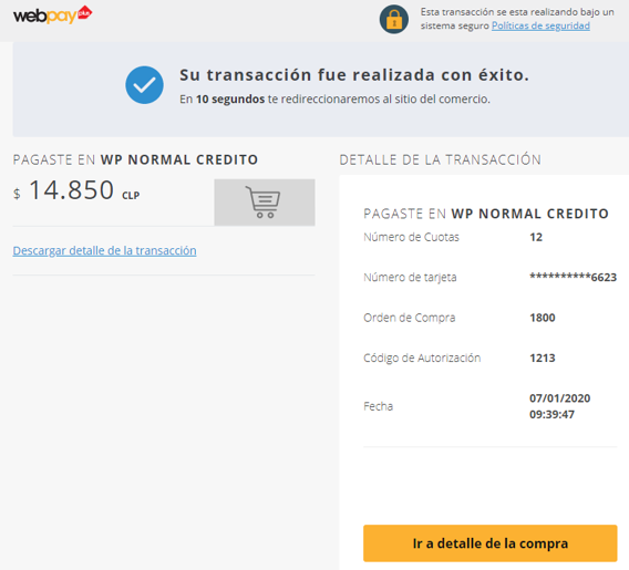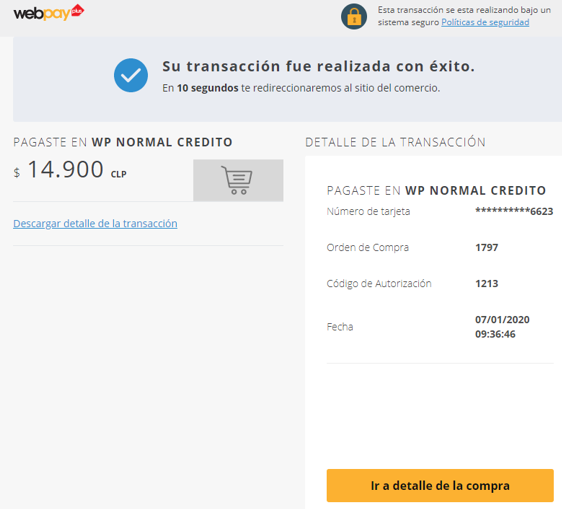 En el resultado de la transacción arrojado por transbank se indica elnúmero de orden de compra (id 1797 de woocommerce) y la fecha y hora de la prueba (07/01/2020 09:36:46). Se sugiere realizar captura de pantalla en forma inmediata para no perder los datos y poder consignarlos en la tabla de resumen de pruebas mencionada anteriormente.