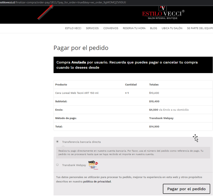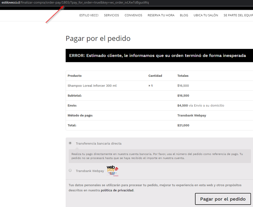 Como el pago no será aceptado, es Woocommerce quien responde indicando el fallo en el pago y el número de orden de compra se encuentra en la url de respuesta (en este caso 1803):