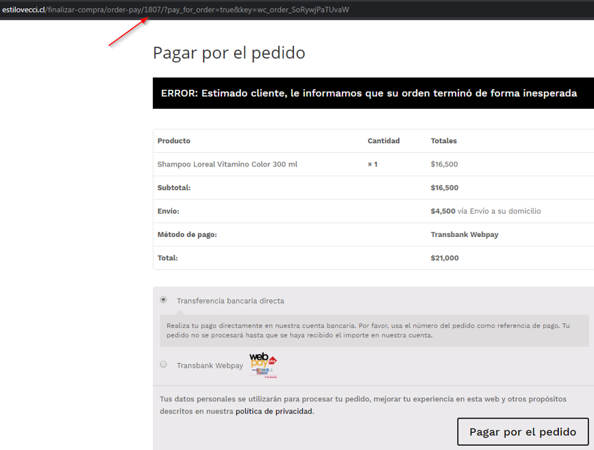 Como el pago no será aceptado, es Woocommerce quien responde indicando el fallo en el pago y el número de orden de compra se encuentra en la url de respuesta (en este caso 1807)