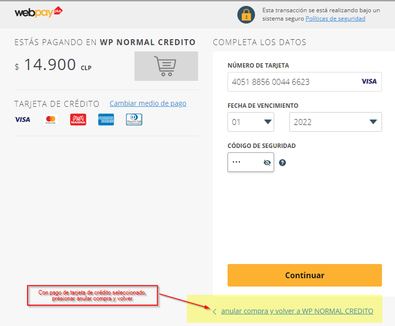 Realizar otro pedido y al momento de ser derivado a webpay, seleccionar tarjeta de credito VISA y luego presionar “anular compra y volver a WP NORMAL CREDITO“