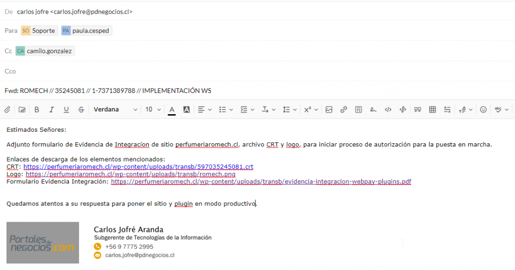 El documento de evidencia debe ser enviado en un mail a soporte@transbank.cl adjuntando el archivo .crt generado y el logo de la empresa en el formato y tamaño especificado por transbank. Estos archivos deben ser adjuntos como enlaces de descarga como en el ejemplo siguiente: